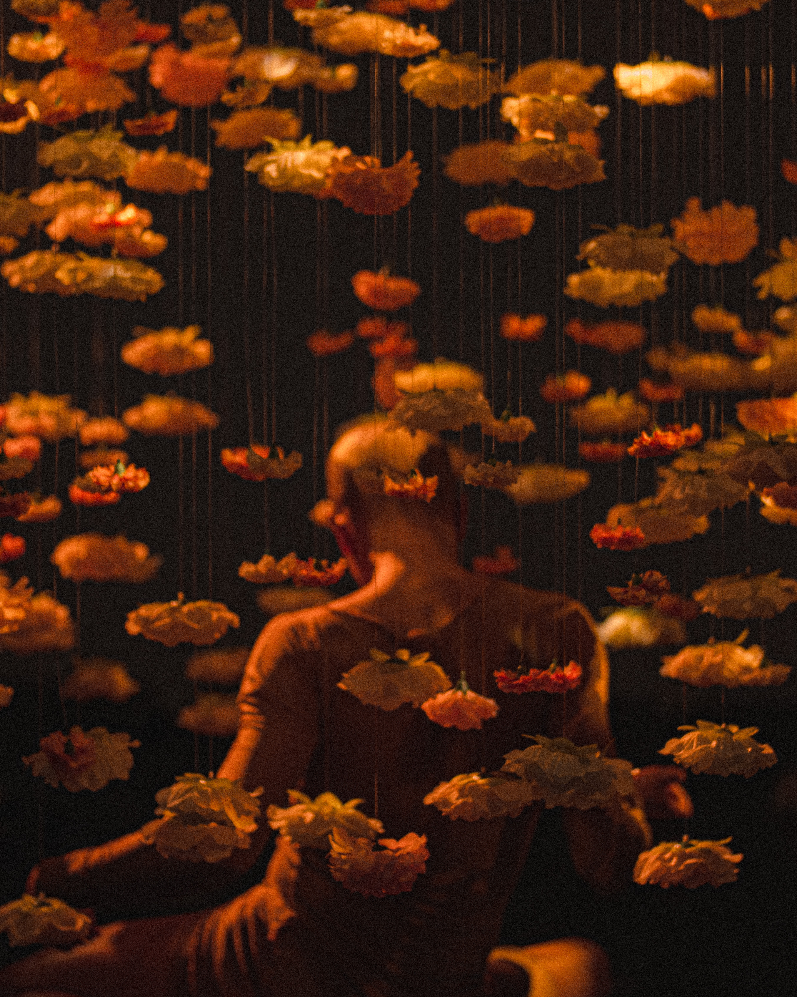 A highlight of this work is a cascade of flowers, designed by Shuling Wong, that telescopes down from the ceiling. Warm lighting by Rhiannon Petersen plays not just on the blooms but the fine wires that hold them in place, so that they gleam enticingly.
